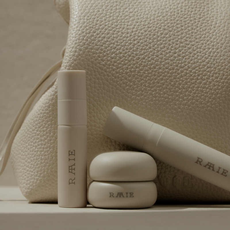 Each set is complete with three deluxe-size minis, inside a luxe RAAIE Mini Cosmetics Bag.